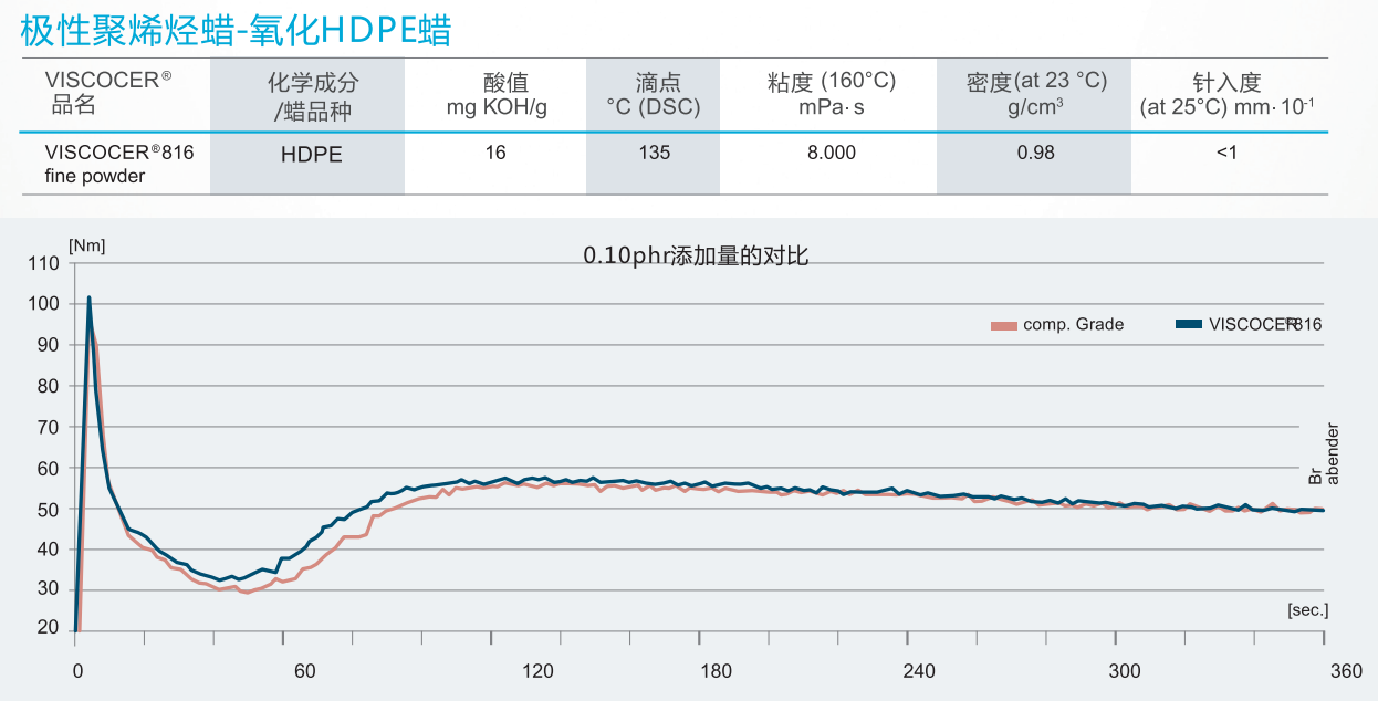 | VISCOCER@ 816 FP | 高密度氧化聚乙烯蠟 | 135 | 16 | 8000(160℃) | 0.98 | 白色粉末 | PVC潤(rùn)滑劑 |